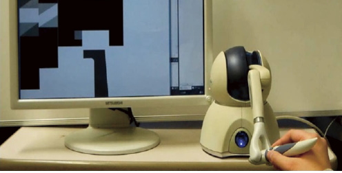 三つ目は、バーチャルリアリティ用の触覚デバイスを使った加工インタフェースの開発です。画面に表示された仮想空間の物体をデバイスで触ると、押し返されるような感覚(力覚)がフィードバックされる触覚デバイスを利用します。これを使えば、画面を見ながらこのデバイスを操作するだけで、実際の機械を思いどおりに動かしながらモノを加工することができます。