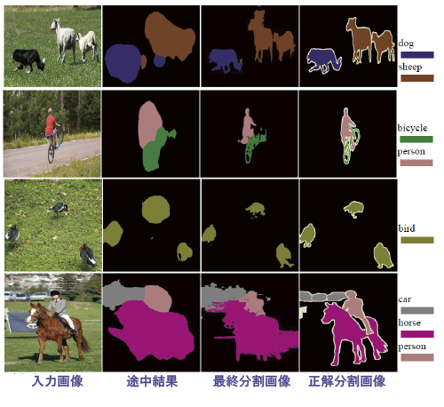 さらに進んで、画像の領域を「分割する」研究にも取り組んでいます。画像認識でコンピュータが人間を超えたといっても、それはまだ限定的な課題にとどまります。高精度な領域分割は今なお人間だけがなせる技ですが、柳井研究室では、この作業をコンピュータに行わせる研究に乗り出しました。
