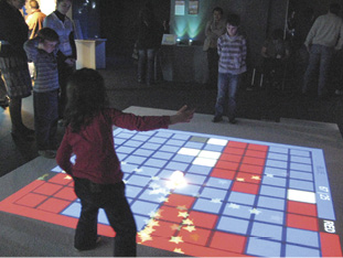 ドアを開けると、そこは狭くてやや急な下りの階段でした。階段を降りると、無地で灰色のカーペットを敷いたフロアが広がっています。児玉さんが照明を消し、部屋の隅にあるパソコンを操作します。するとフロアに、茶色のマス目模様が浮かび上がりました(図1)。将棋や囲碁などの盤面のようです。パソコンの画面を天井のプロジェクタから、床に投射しているのだと分かりました。