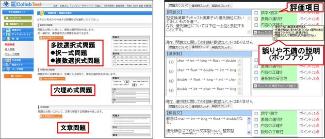 学生が作成したこの問題について、教員が必要に応じて手を加えながら、既存の問題に追加する形でウェブ上で実施するオンラインテストを構成し、学生に解かせます。このようにして学生間、および学生と教員間で協調し、またグループ単位で競い合うことなどを通じて学習の理解度を深める仕組みです。数学やプログラミングといった情報系から、国語や英語などの語学、さらに農業実習などの実践教育に至るまで、あらゆる科目に適応してきたそうです。