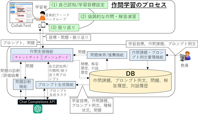 最近は、生成AI(人工知能)との対話を通じて作問学習を支援するシステムの開発にも取り組んでいます。米オープンAIの生成AI「ChatGPT」(GPT-4)に、より理解を深める作問プロセスのための指示(プロンプト)を提示させ、それに従いながら段階的に作問や学習の「振り返り」を行ったり、作成した問題をChatGPTに入力して評価してもらったりすることで、作問による学習効果が高まるほか、作成する問題の質も向上させられる可能性があるそうです。高木准教授は「生成AIの導入によってAIに個別指導のような役割を担わせることができ、さらに学習者の理解をより深められる」と期待しています。