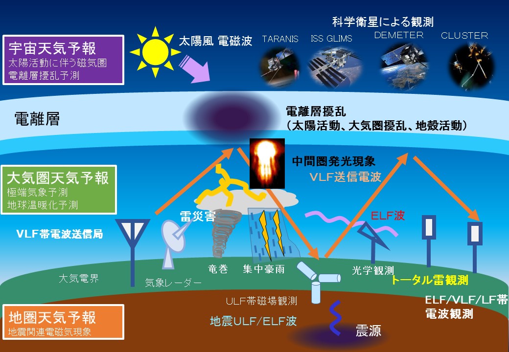 電磁波工学、人工衛星、プラズマ、電離層、ULF、ELF、VLF、Qds、中間圏発光現象(レッド・スプライト)、地圏・大気圏・電離圏結合、GLIMS、国際宇宙ステーション、雷放電、地震予知、宇宙天気予報、シューマン共振、極端気象予測、世界気候変動、トータルライトニング