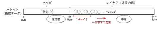 そこで八巻助教は、処理速度を向上させる上でボトルネックになっていた「文字列探索処理」の高速化に取り組みました。従来の処理法は、例えば「virus(ウィルス)」という文字列を探索する際に、「v」「i」「r」… というように、パケットの先頭から1文字ずつマッチングさせる必要がありました。