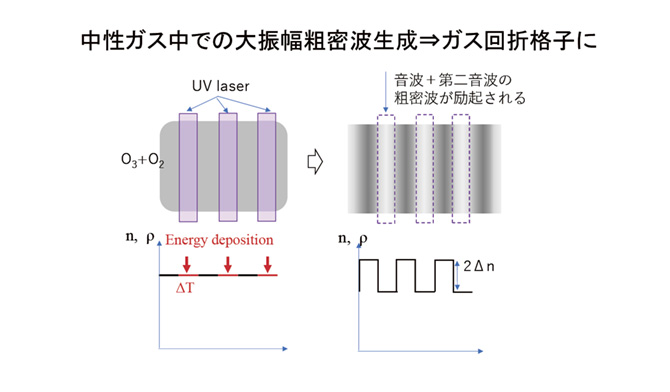 そこで道根特任助教が注目したのは、オゾンガスと紫外光です。オゾンは波長250ナノメートル(ナノは10億分の1)付近の紫外領域の光をよく吸収します。オゾンを含む酸素ガスに2本の紫外レーザーのパルス光をうまく制御しながら周期的に当てることで、通常の音波と比べ、けた違いに大きな粗密の波を励起させることに成功しました。その結果、大きな密度変調構造を作製でき、これによって高い効率で光を回折できるようになりました。